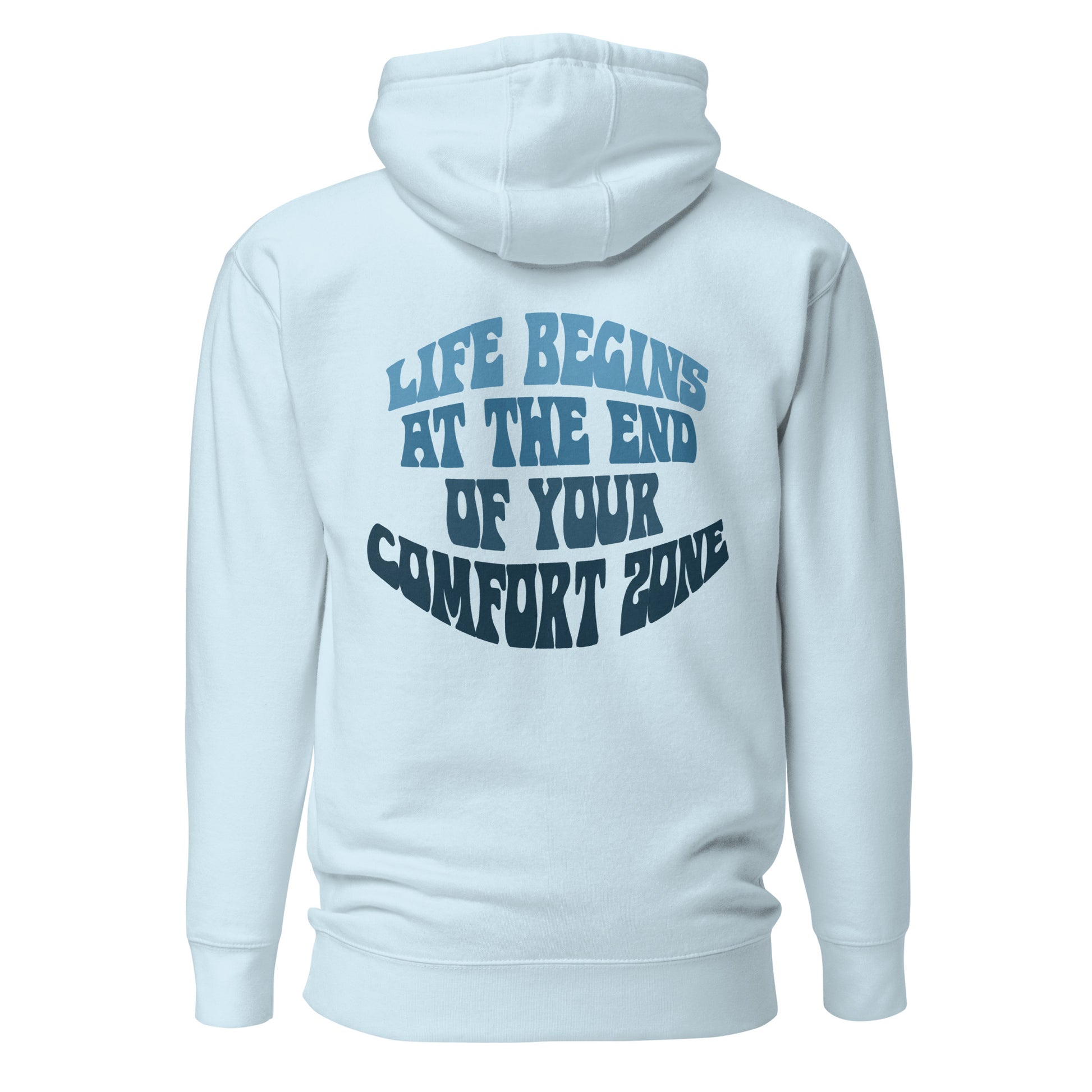 The back of the hoodie features the powerful and inspiring quote, "Life Begins at the End of Your Comfort Zone", printed in bold and contrasting letters. This graphic serves as a reminder to embrace change and challenge yourself to try new things, even when it's uncomfortable or scary.
