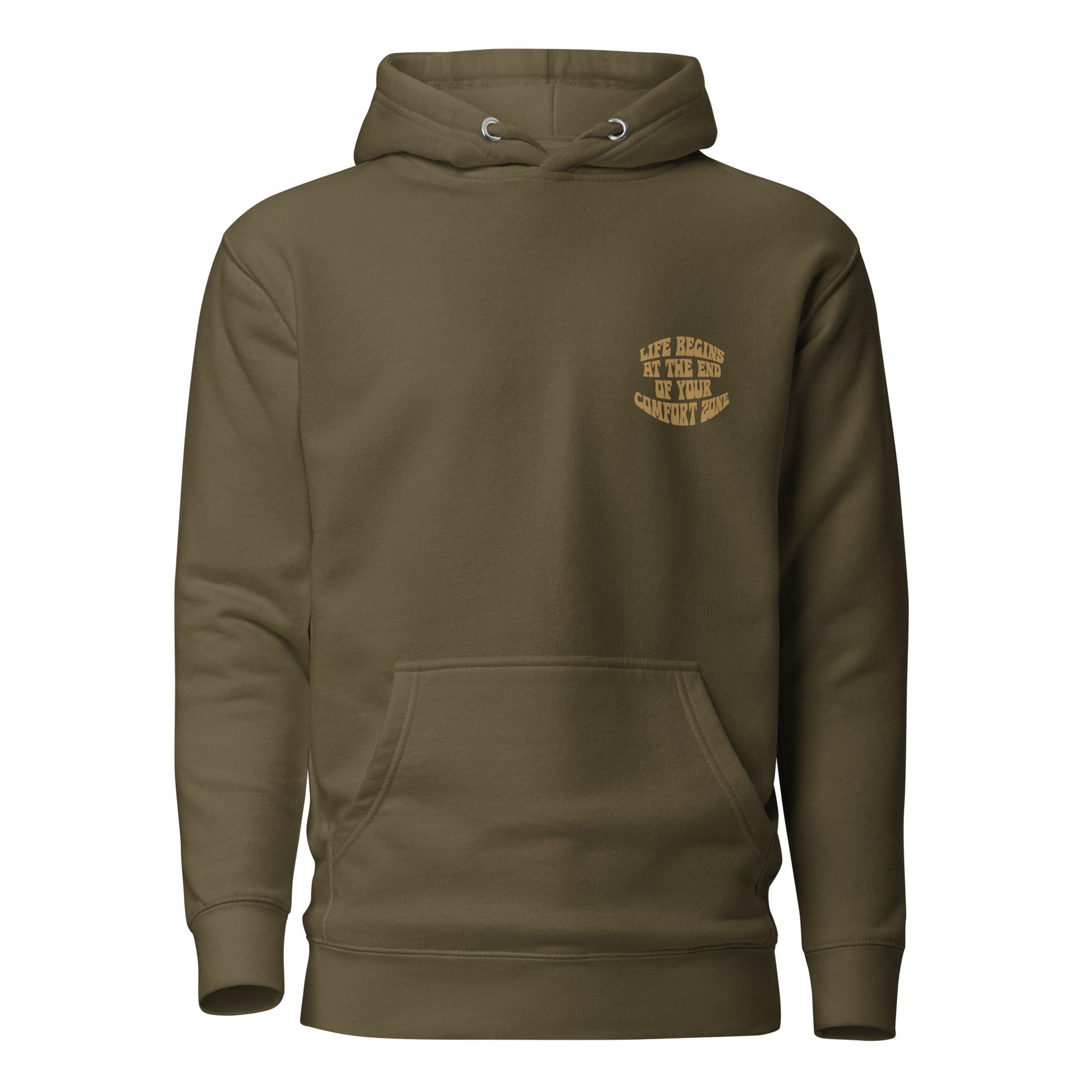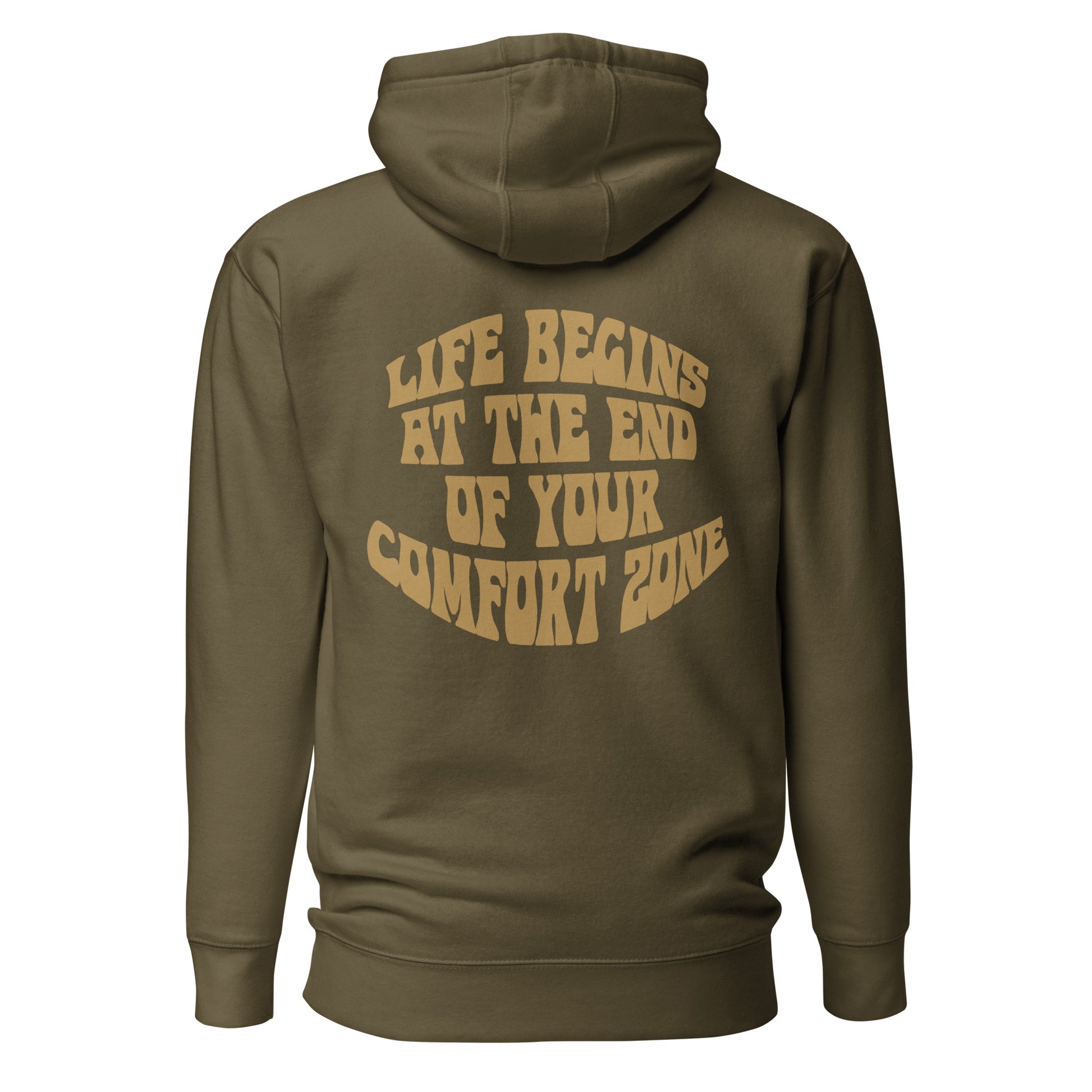 The back of the hoodie features the powerful and inspiring quote, "Life Begins at the End of Your Comfort Zone", printed in bold and contrasting letters. This graphic serves as a reminder to embrace change and challenge yourself to try new things, even when it's uncomfortable or scary.